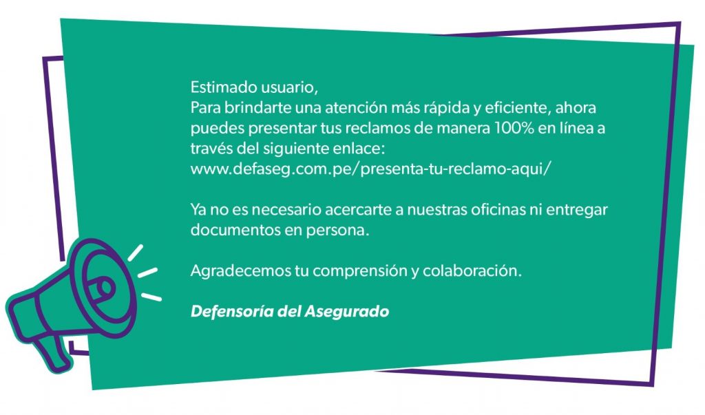 Los reclamos por escrito deben presentarse (en 3 ejemplares) en mesa de partes de la Defensoría del Asegurado ubicada en Calle Amador Merino Reyna 307, piso 9, San Isidro, Lima.